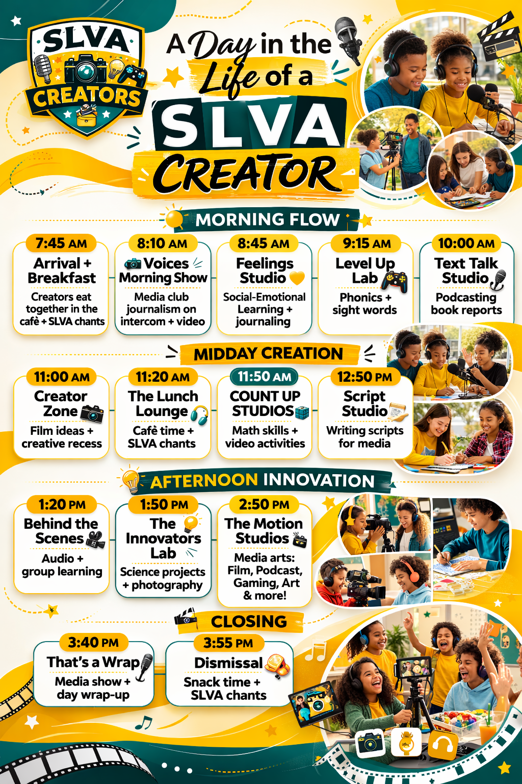 The final step in the enrollment process is to schedule a Friday to join creators at SLVA for fun, enrollment, tours, and registration, finalizing with the team. We’ll take this time to answer your questions and ensure your enrollment forms are filled out completely while engaging you with the culture of the Voices community.
